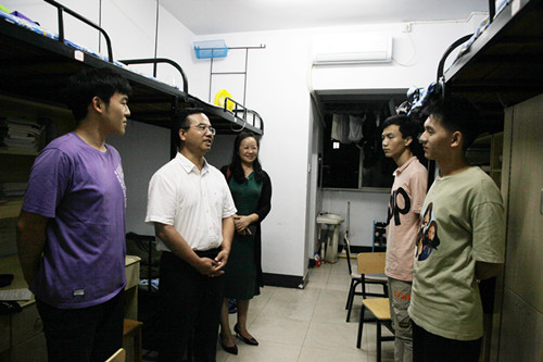本网讯 (宣传部 李晗枫 商学院 邹亚)9月15日,学校党委书记陈弘、副校长张立带领相关职能部门负责人走进学生宿舍园区,实地察看园区维修工程进展情况,详细了解同学们的学习生活情况,并与同学们亲切交流。