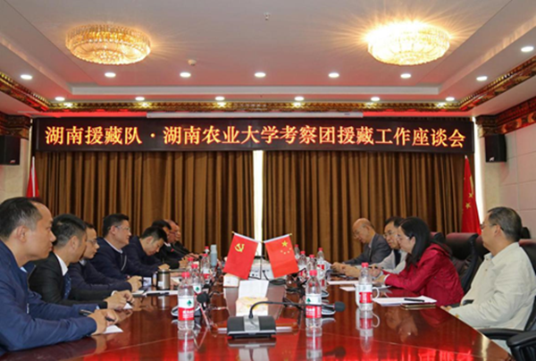 杨昶对邹学校一行的到来表示热烈欢迎,对湖南农业大学关心支持援藏工作表示衷心感谢,并介绍了湖南省第九批援藏工作队进藏两年多来的工作情况。杨昶强调,湖南省援藏队的工作重心是急山南所需、尽湖南所能,从过去注重基础设施建设转变为注重产业造血功能培育,围绕山南特色产业,逐步树立良好品牌。杨昶表示,希望湖南农业大学利用高校优势,在帮助山南提高农作物产量、推动山南农业特色产业发展给予更多技术支持,增加援藏工作合作机会,努力让山南群众得到更多实惠,不断推动湖南援藏工作高质量发展。