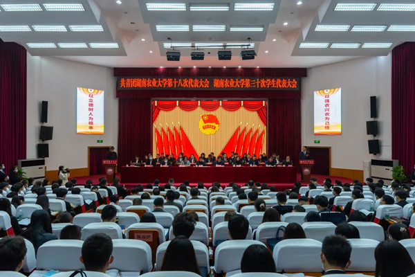 本网讯(团委 覃茜 傅志轩 吴九志 谷灵云)12月12日上午,共青团湖南农业大学第十八次代表大会、湖南农业大学第三十次学生代表大会在修业讲堂开幕。大会的主题是:高举习近平新时代中国特色社会主义思想伟大旗帜,全面贯彻党的十九大和团的十八大精神以及学校第九次党代会精神,以立德树人为根本,以强农兴农为己任,全面深化共青团改革,全力提升人才培养质量,为建设“质量卓越、优势突出、特色鲜明”的国内一流农业大学贡献青春力量。
