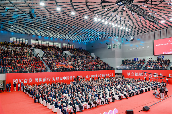 会场内,习近平总书记“以立德树人为根本 以强农兴农为己任”的殷殷嘱托和“扎根湖湘大地办大学 服务‘三高四新’”的使命任务分列会场两侧,党的二十大关于“建设中国特色、世界一流大学和优势学科”的奋斗目标振奋人心,百廿荣光璀璨再现。