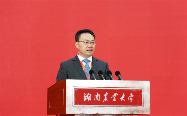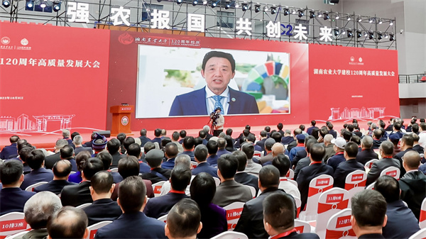 邹学校作题为《强农报国 共创未来》的大会致辞。他表示,120年来,为时养器始终是湘农人的坚定信念,朴诚奋勉始终是湘农人的精神内核,求实创新始终是湘农人的价值追求,强农报国始终是湘农人的使命担当。新时代的湘农,坚守立德树人之本,培育了大批知农爱农新型人才;集聚科技创新之势,加速了“双一流”建设步伐;扛牢服务“三农”之责,书写了助推乡村振兴的湘农篇章;绘就文化校园之美,构建了和谐文明的精神家园;坚持开放办学之道,开创了国际交流合作的新局面。他强调,展望未来,我们将主动求变,以高水平农业人才培养为强国建设提供有力支撑;挺膺担当,以农业科技创新赋能“国之大者”;守正创新,努力将优秀传统文化转化为师生员工的精神内涵和品性追求;胸怀天下,以合作交融推动构建人类命运共同体,汇聚全校师生员工和广大校友的磅礴力量,踔厉奋发、勇毅前行,在强国建设、民族复兴的新征程上再作新贡献、再创新辉煌。