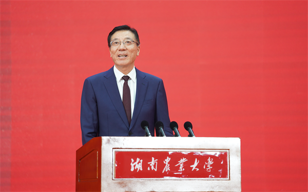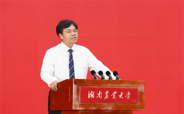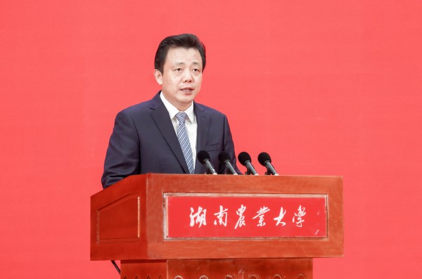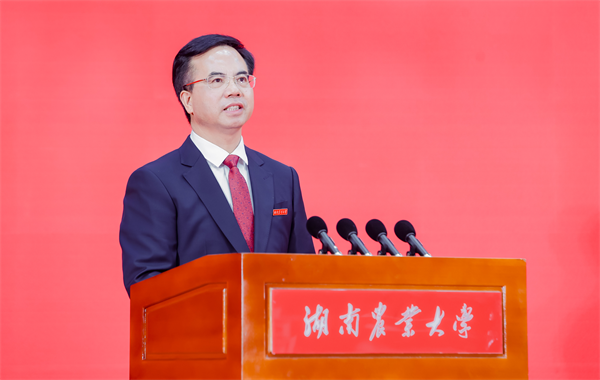 秦国文向湖南农业大学表示热烈祝贺,向全体师生员工和广大校友表示诚挚问候。他希望湖南农业大学站在新的征程起点上,自觉肩负起兴农报国使命,以立德树人为根本,以强农兴农为己任,在培养知农爱农新型人才上展现更大作为,在聚焦国家重大战略需求、加快高水平农业科技自立自强上彰显更大担当,在服务地方经济社会发展、推进乡村振兴和农业强省建设、实现“三高四新”美好蓝图上贡献更大力量。