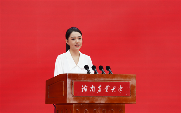 校友代表谢道昕深情回忆了在母校学习生活时光,为母校的建设发展成就倍感骄傲和自豪,并表示无论身在何地,都将一如既往地尽己所能,为母校的发展聚力献策。他寄语湘农学子,将个人的前途与祖国的命运紧密相连,胸怀强农报国信念,获取广博的学识、磨炼坚强的意志、形成高尚的品格、锻炼健康的身体,早日成才,在国家富强民族振兴的征途上展示靓丽风采,留下青春足迹。