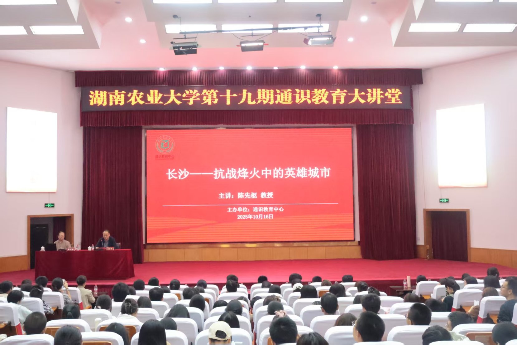 10月16日上午,我校第十九期通识教育大讲堂在修业讲堂开讲。湖南省文史研究馆馆员、著名地方史研究专家陈先枢教授应邀作题为《长沙——抗战烽火中的英雄城市》的专题讲座,带领师生走进那段烽火连天的岁月,感受一座城市的民族气节与历史担当。通识教育中心主任王永昌主持讲座,全校300余名师生共同聆听。
